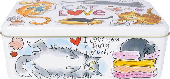 Het Blond Amsterdam Bewaarblik Kat 19,5X10X7 cm is een bewaarblik van het bekende merk Blond Amsterdam, met vrolijke kleuren en afbeeldingen van verschillende katten. Fleur jouw servies op met dit leuke bewaarblik van Blond Amsterdam! Dit 'cat love'- blik is onderdeel van de lijn artikelen met dierenafbeeldingen uit de Dog Lover en Cat Lover lijn. Het blik is uitgevoerd met vrolijke kleuren en figuurtjes!
