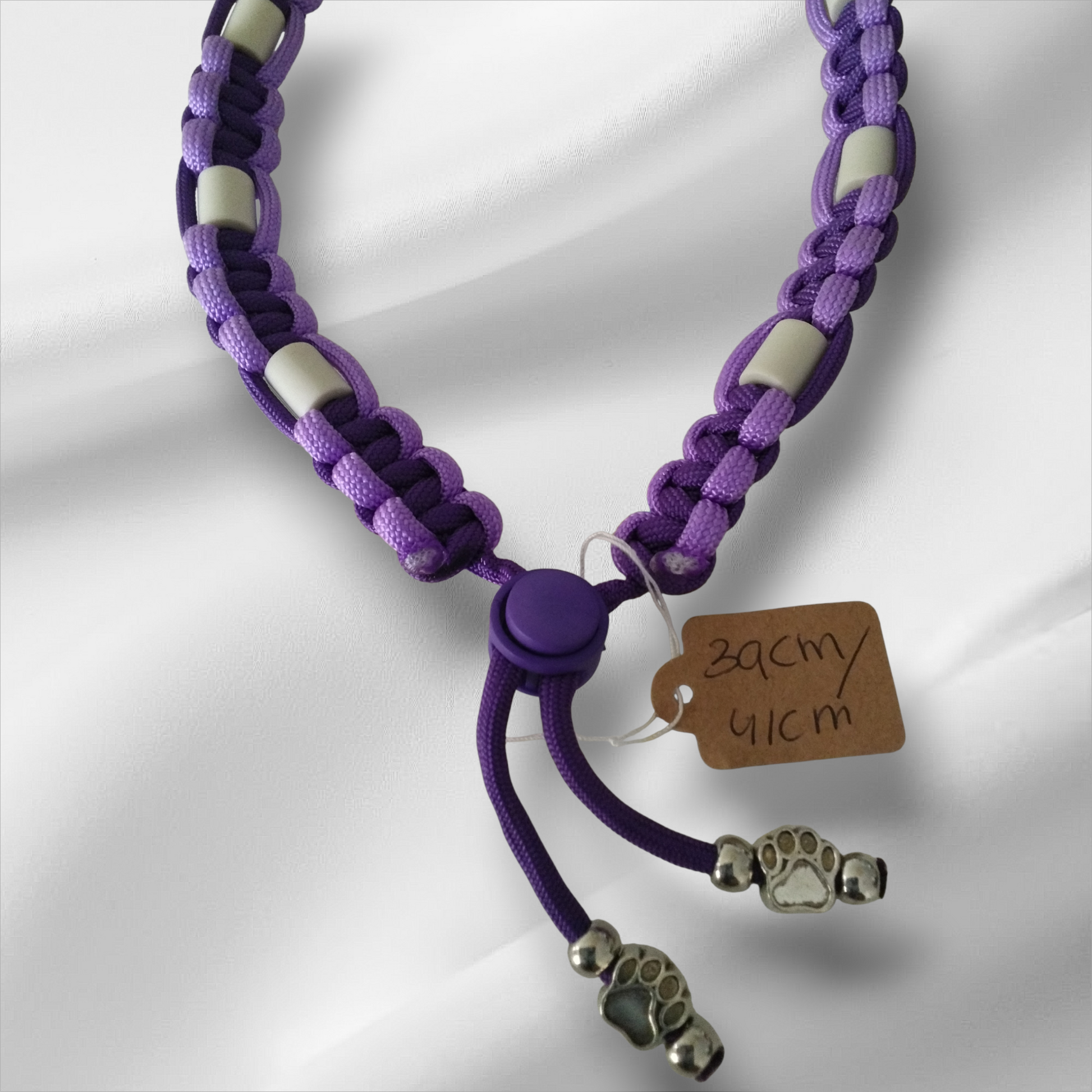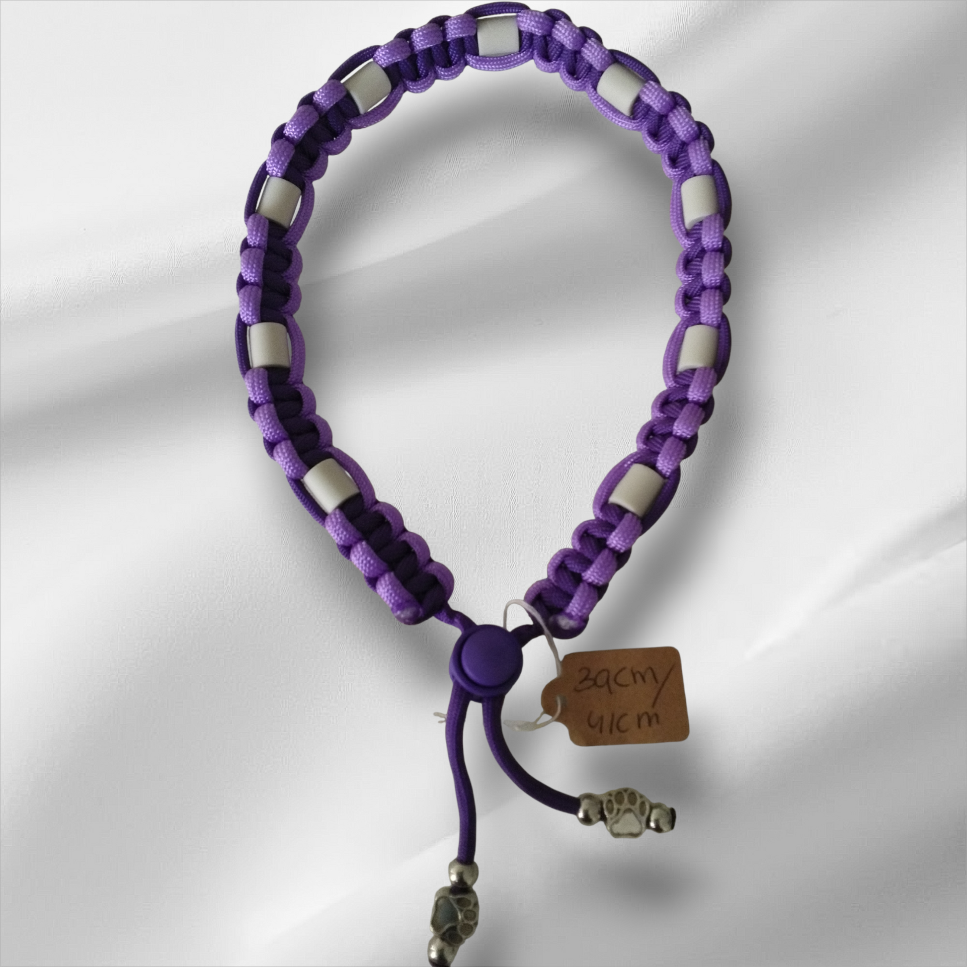 De banden maken wij ook op bestelling. Geef via ons contact formulier aan wat de halsomtrek van je hond is en welke kleuren paracord je wenst.
